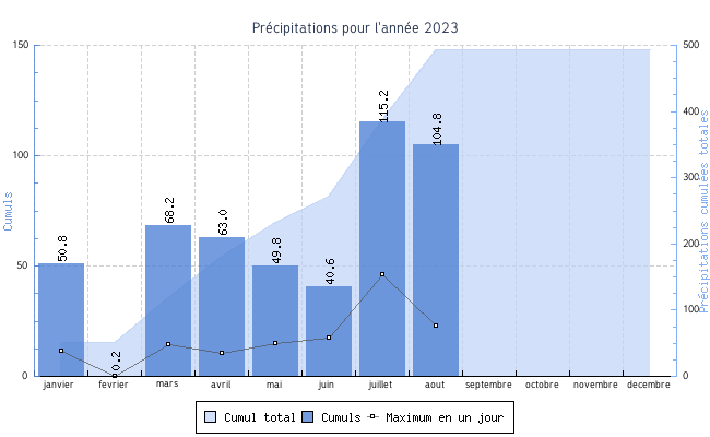 | janvier | -4.4 °C | 3.1 °C | 15.6 °C | 8.3 °C | 5.8 °C | 5.4 km/h | 51.5 km/h | SO |
