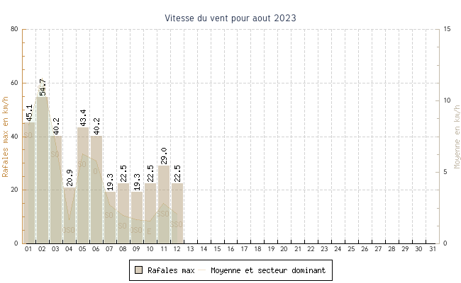 | min | max | moy | Vitesse (rafales) | Secteur | ||